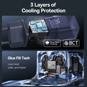 - 3 rétegű hűtésvédelem: A Baseus töltő a fejlett 3 rétegű hűtési rendszerrel, beleértve a kettős rétegű hűtést és a szabadalmaztatott Baseus Cooling Technology (BCT) megoldást is, garantálja a stabil és biztonságos működést még intenzív használat mellett is.