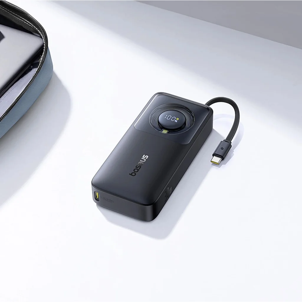 - Kényelmes utazás közbeni töltés. A 70 cm-es visszahúzható USB-C kábel könnyen elrejtőzik a házában, biztosítva a kényelmes használatot.