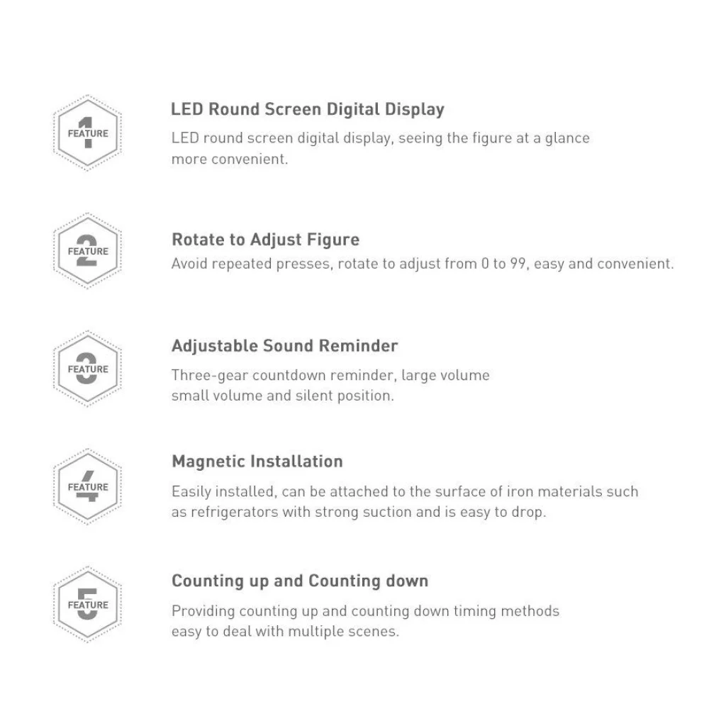 A Baseus időzítőt a nap bármely órájában használhatod. Ez a beépített LED világításnak köszönhető. Kerek alakjának köszönhetően az eszköz bármilyen helyzetben nagyszerűen mutat, bárhová is helyezed. A felhasználói kényelem érdekében hangjelzéssel és kétirányú visszaszámlálási lehetőséggel van ellátva - csökkenő és növekvő módban. Az időtartomány 0-tól 99:55 percig terjed.