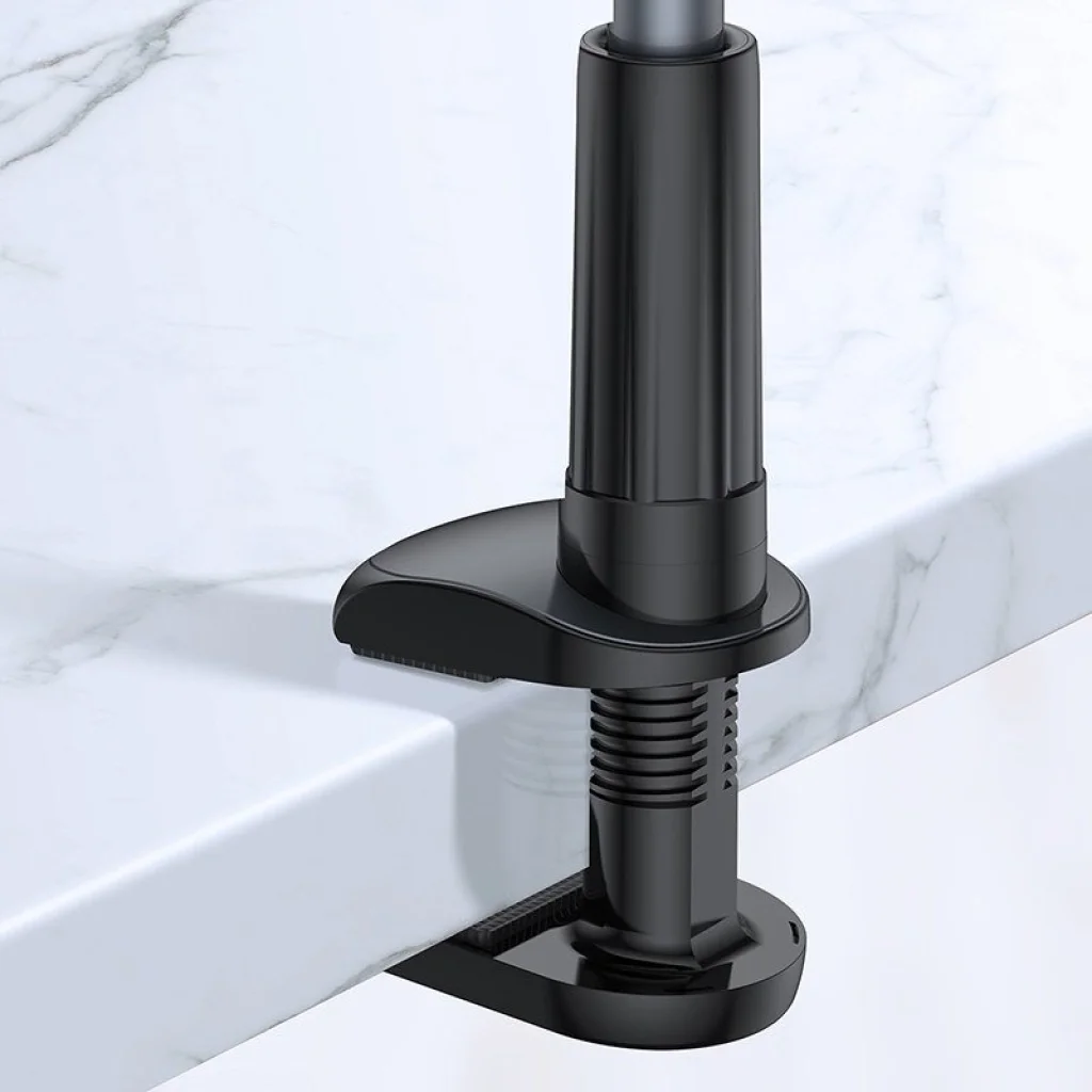 A fogantyú nagyon könnyen összeszerelhető és szétszerelhető. A tartó elcsavarásához és kinyitásához elég egy mozdulat. A tartó alapja egy masszív csíptető segítségével könnyen rögzíthető íróasztalra, asztalra vagy polcra.