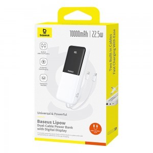 A Baseus Lipow 10000mAh 22,5W powerbank egy praktikus és sokoldalú hordozható eszköz, amely egyesíti a kompakt kialakítást, a gyors töltést és a kényelmes használatot. Két beépített USB-C és Lightning kábellel, valamint egy további Baseus Simple USB-A - USB-C 3A 20cm kábellel rendelkezik, így azonnal használatba vehető a csomagolásból kivéve. Akár 22,5W teljesítményű töltést is támogat, rendelkezik olvasható dinamikus LED kijelzővel, és lehetővé teszi több eszköz egyidejű töltését. Kiváló választás mindennapos használatra és repülőutakra is.