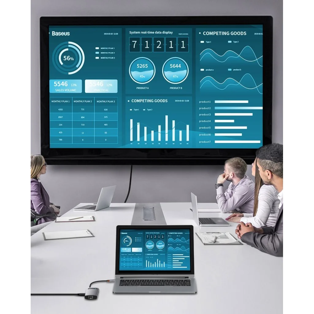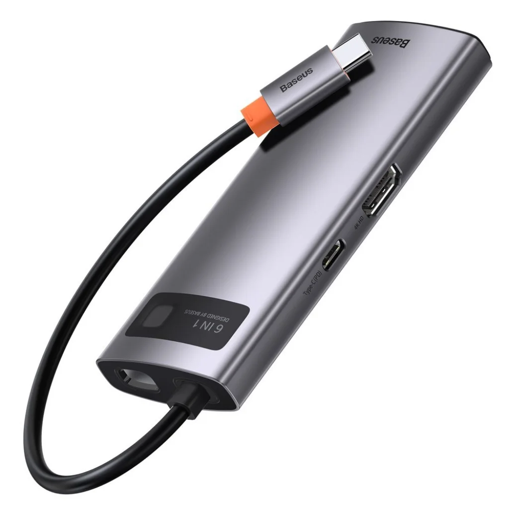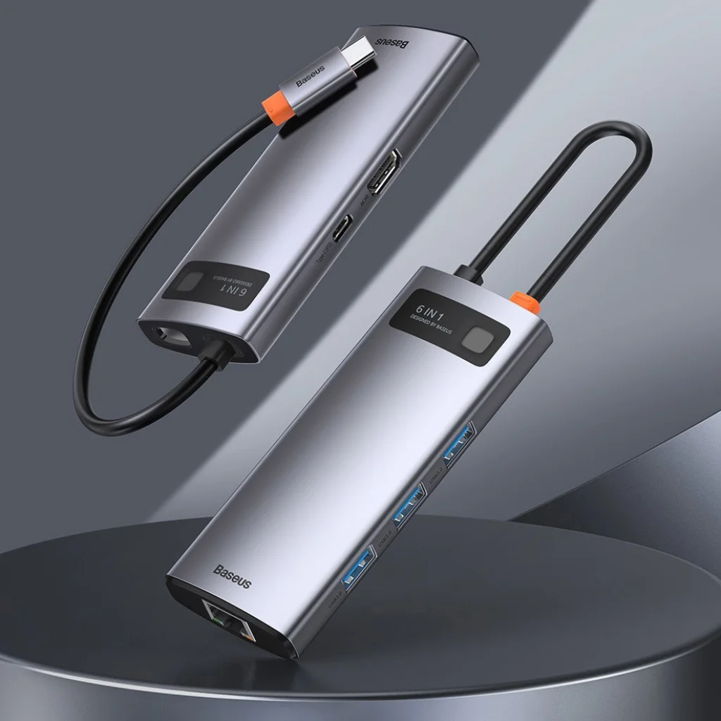 A HUB különösen hasznos, ha korlátozott számú porttal rendelkezik. Hat további portot biztosít: 3x USB 3.0, HDMI, USB-C PD, RJ45. Érdemes megemlíteni, hogy a HDMI csatlakozó képes 4K felbontású videó megjelenítésére. Ha egy 100W teljesítményű USB-C töltőt csatlakoztat a HUB-hoz, gyorsan feltölthetjük a laptopot vagy a táblagépet. Az USB 3.0 portok lehetővé teszik az adatok átvitelét akár 5 Gbps sebességgel.