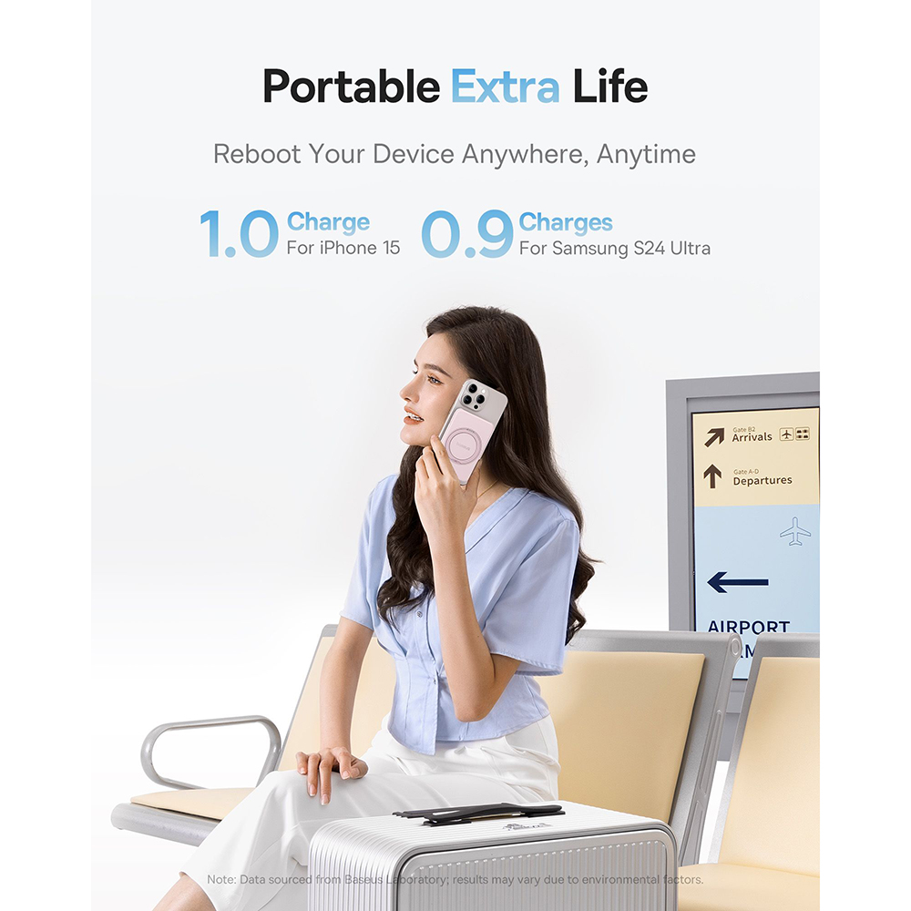 Az 5000mAh-s kapacitás elegendő energiát biztosít ahhoz, hogy telefonját újjáélessze. Például egy iPhone 15 készüléket 1.0 alkalommal, egy Samsung S24 Ultra készüléket pedig 0.9 alkalommal tölthet fel, így sosem marad energia nélkül a legfontosabb pillanatokban, legyen szó utazásról vagy mindennapi használatról.