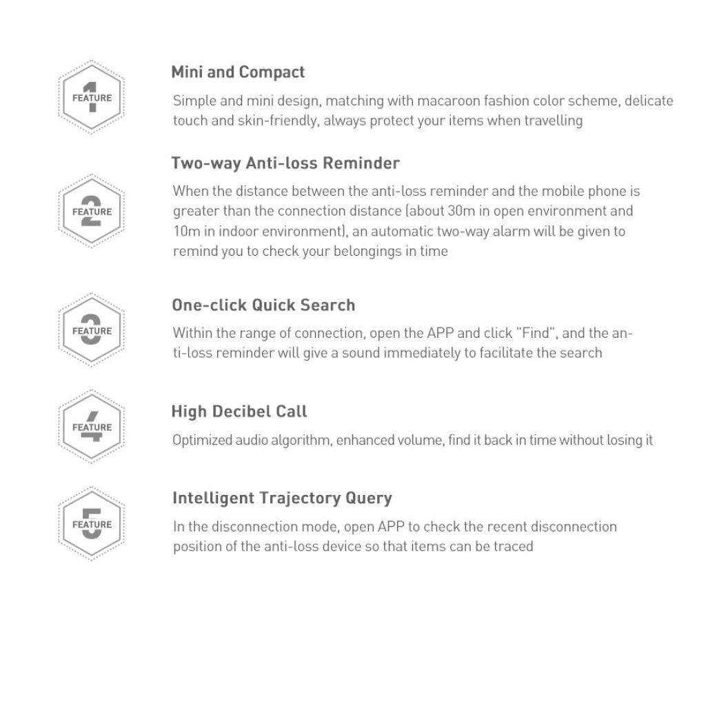 Kompakt méretű, több célú felhasználásra szánt detektor. Kedvenc tárgyaink megtalálását segítő, kettős védelmi rendszerrel ellátott eszköz. Ha a detektor és telefonunk közötti távolság meghaladja a biztonságos mértéket, telefonunk rögtön jelezni kezd, hogy tulajdonunk biztonsága veszélybe került. Saját applikációján belül bármikor leellenőrizhetjük a jelenlegi távolságot és pontos helyszínt. Leválasztódás esetén, a legutolsó csatlakoztatott helyszínt is láthatjuk. Optimalizált hang algoritmusának köszönhetően, hallható hangerőn ad hangjelzést, hogy minél könnyebben megtalálhassuk.