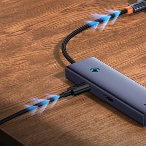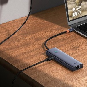A Baseus UltraJoy 6 az 1-ben USB-C Hub könnyíti meg mindennapi munkáját a számítógép előtt. Három USB 3.0 porttal rendelkezik, amelyek akár 5 Gbps adatátviteli sebességet tesznek lehetővé. Tartalmaz egy HDMI-portot, amely támogatja a 4K@30Hz-es felbontást, valamint egy RJ45-ös csatlakozót akár 1000 Mbps csatlakozási sebességhez. A 100 W-os PD gyors töltésnek köszönhetően laptopja vagy okostelefonja töltésére is használható. Kompatibilis számos eszközzel, és kompakt kialakításának köszönhetően mindig kéznél lehet.