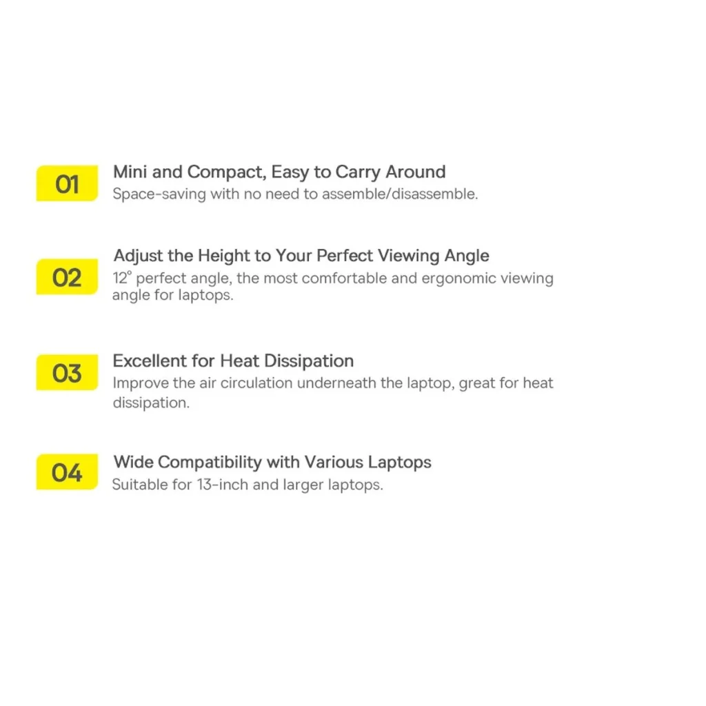 A jól ismert és elismert Baseus márka univerzális kiegészítője minden laptopfelhasználónak hasznos lesz. A könnyű és kompakt, öntapadós állványkészlet lehetővé teszi, hogy a készüléket minden körülmények között kényelmesen használjuk - csak ragasszuk fel őket és hajtsuk szét.