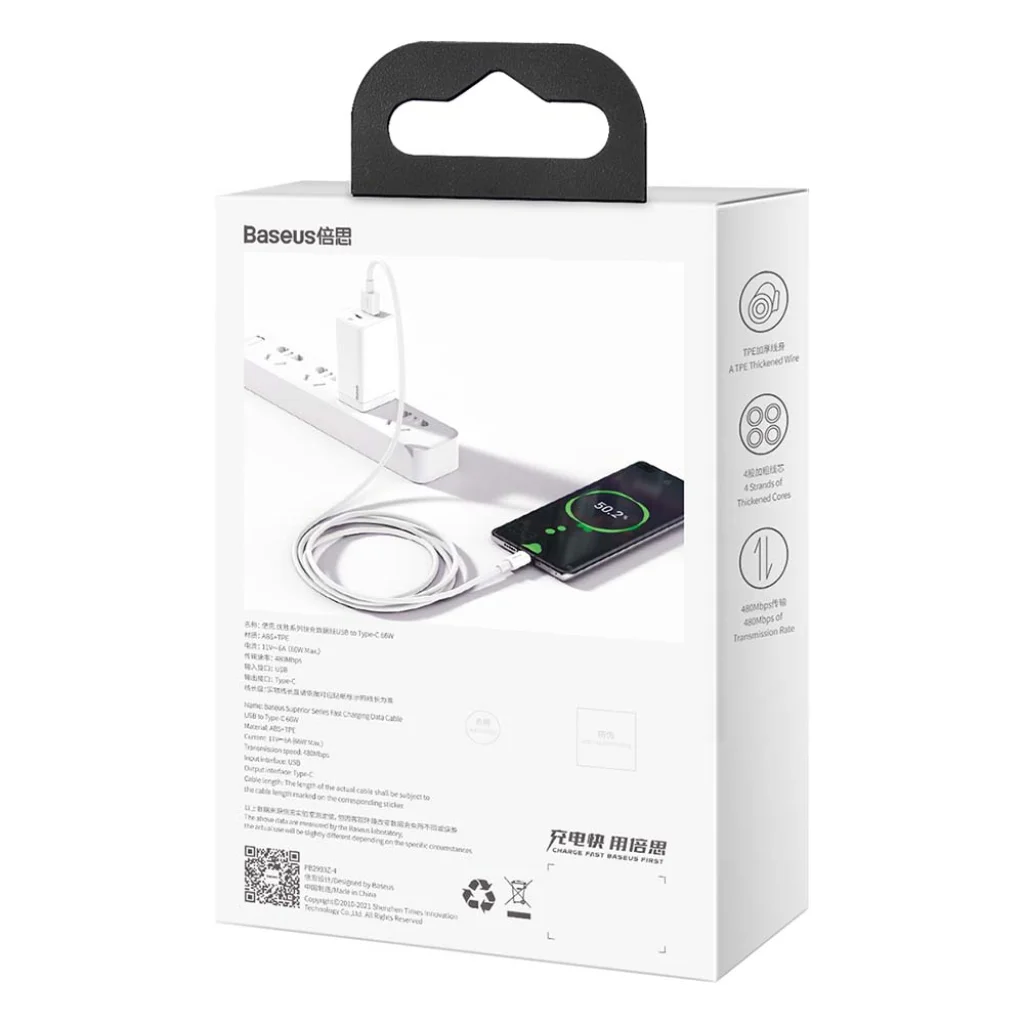 Élvezd a gyors és megbízható töltést, valamint az azonnali adatátvitelt a Baseus Superior sorozatú USB-A - USB-C kábellel. Ez a prémium minőségű, 2 méteres, fehér színű kábel tökéletes választás mindennapi használatra, egyesítve a kiemelkedő tartósságot a magas teljesítménnyel és az elegáns designnal.