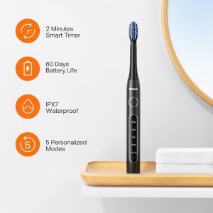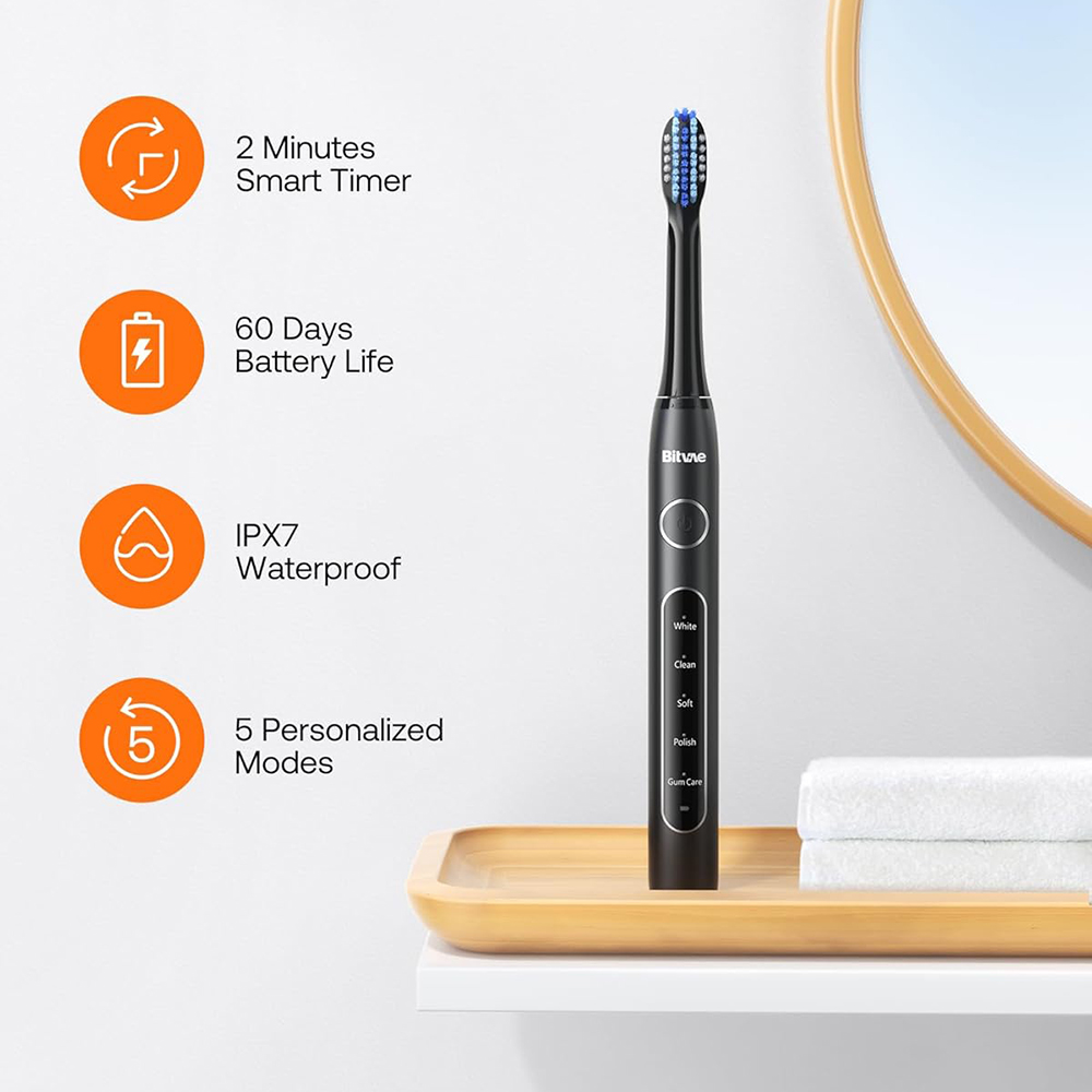 Termék leírás Bitvae - Elektromos Fogkefe Napi (D2) - Ultrahangos, 8 Fej, Tartó, Tok, Intelligens Időzítő, IPX7, 5 Mód, Újratölthető - Fekete
