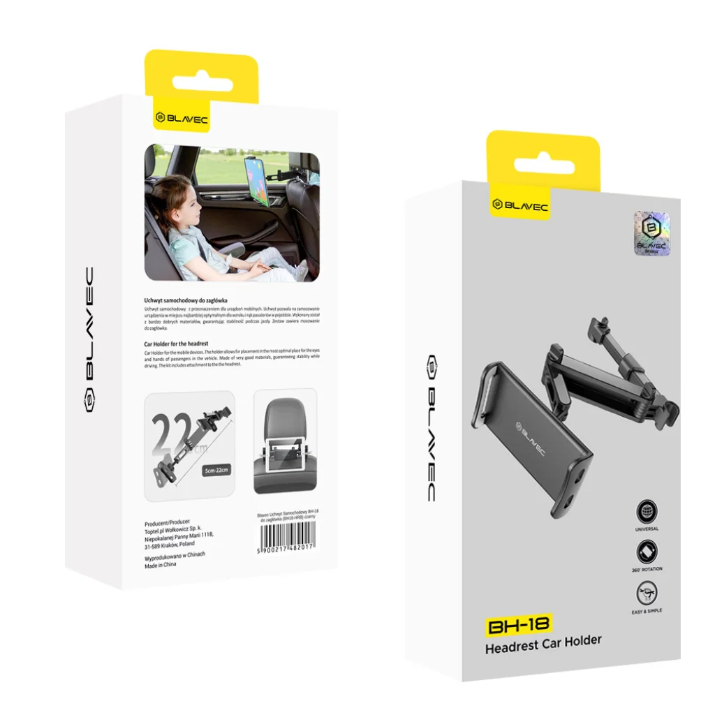 A Blavec BH-18 fejtámlára rögzíthető autós tartó (BH18-HRB) egy kiváló minőségű és rendkívül funkcionális kiegészítő, amely garantálja a stabilitást és kényelmet utazás közben. Akár hosszú családi utazásokra indul, akár a mindennapi ingázás során szeretné lekötni a hátsó ülésen utazókat, ez a tartó ideális megoldást nyújt tablet vagy okostelefon biztonságos és kényelmes használatához.