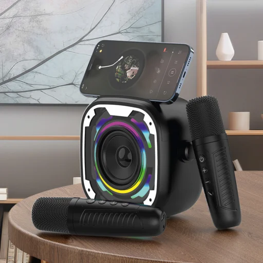 - Telefontartó – A hangszóró kényelmes tartóval rendelkezik, amelybe elhelyezheti okostelefonját karaoke vagy zenelejátszás során.