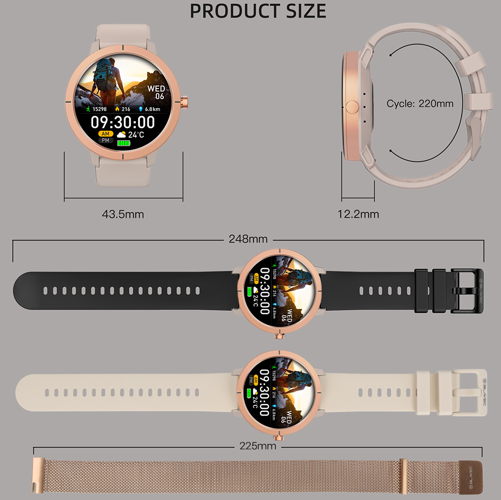 - Két cserélhető 18 mm-es szíj: A dobozban két kiváló minőségű szíj található: egy puha szilikon szíj a sportos és mindennapi viselethez (például a képeken látható krém színű), valamint egy elegáns rózsaarany milánói fém szíj az exkluzív megjelenésért. Váltson stílust pillanatok alatt!