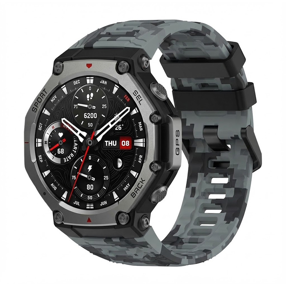 - Kényelmes, cserélhető szíjak: A standard 22 mm-es rugós rögzítésű szilikon szíj (grafit színben + 1 extra szíj, mely a képeken látható terepmintás változat is lehet) gyorsan és egyszerűen cserélhető más stílusokra, így mindig az alkalomhoz illő megjelenést választhatja. A szíj és óratok együttes hossza 260 mm, maximális csuklókerülete 235 mm.