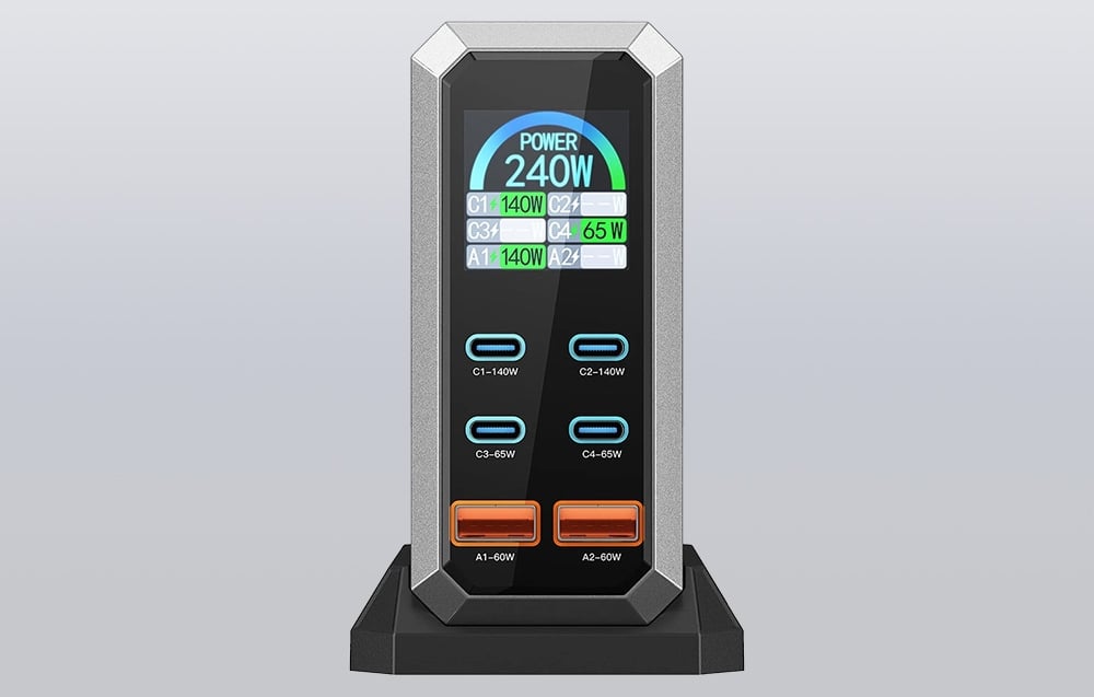 A két USB-C port (C1 és C2) támogatja a Power Delivery 3.1 és a PPS szabványt, és akár 140 wattos teljesítményt is kínál - így könnyedén tölthet olyan berendezéseket, mint a MacBook Pro 16 vagy más igényes eszközök. A többi port (C3 és C4) egyenként 65 wattot biztosít, az USB-A portok pedig a QC 3.0 gyorstöltést támogatják, akár 60 wattal. Egyszerre akár 6 eszközt is táplálhatsz a teljesítmény feláldozása nélkül.