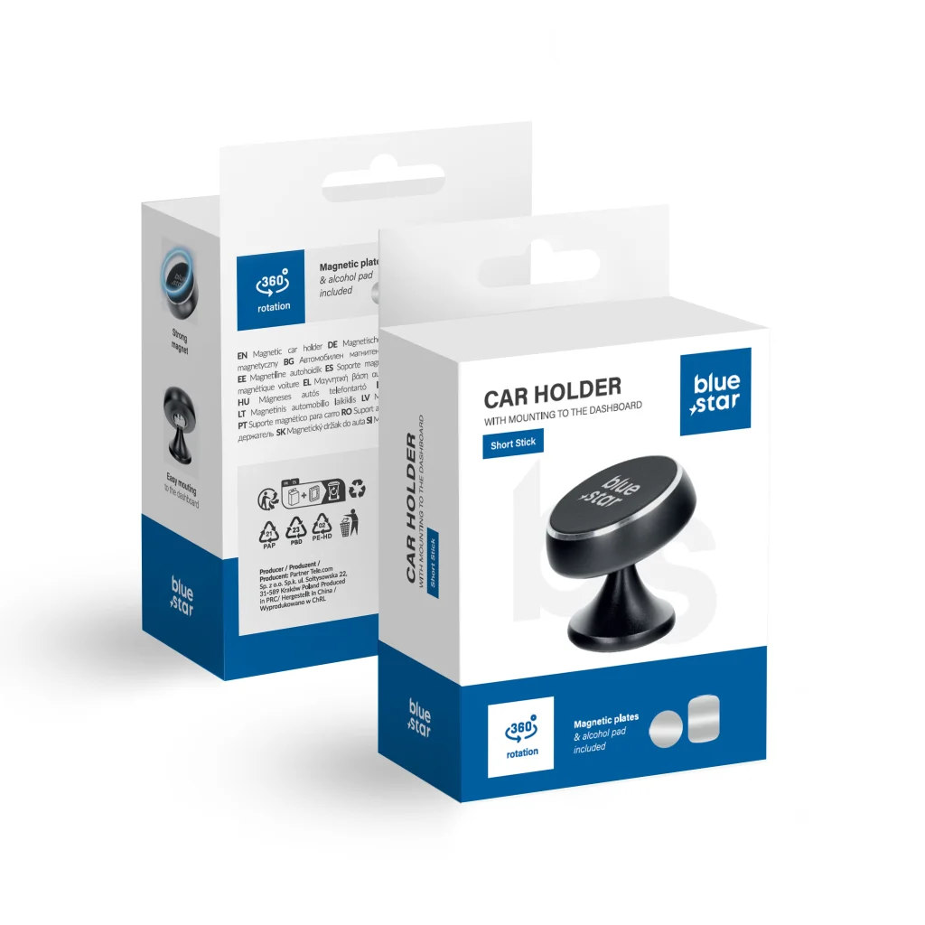 A BLUE STAR SHORT STICK mágneses autós tartó elegáns és funkcionális kiegészítője autójának. Komfortos használatra tervezve, lehetővé teszi, hogy telefonját gyorsan és stabilan rögzíthesse a műszerfalra egy erős mágnes segítségével. Fontos megemlíteni, hogy a tartó az asztalra is rögzíthető. A tartó előnye a forgatható kialakítása, amely lehetővé teszi a készülék látószögének könnyű, 360 fokos beállítását. Egyszerű és gyors telepítése a műszerfalra vagy az asztalra rendkívül praktikus, és nem igényel további eszközöket. A készlet tartalmaz két fémlemezt (kerek és téglalap alakú) és egy alkoholos alapozót, amely problémamentes telepítést tesz lehetővé és további biztonságot nyújt a mobil eszköz számára.