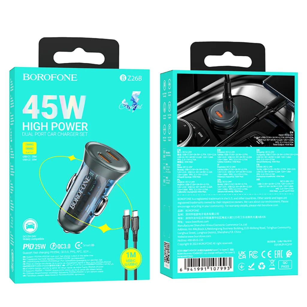 -Kimenet: Type-C 1: 25W(PD/QC/FCP/AFC); Type-C 2: 20W(PD/QC/FCP/AFC); C 1+C 2=45W