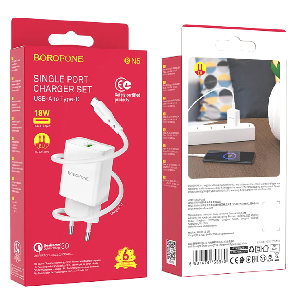 A Borofone BN5 nem csupán gyors és praktikus, hanem elegáns is. A hófehér szín és a minimalista design kiválóan illeszkedik bármilyen környezetbe, legyen szó otthonról, irodáról vagy utazásról. A termék számos biztonsági tanúsítvánnyal rendelkezik (például CE, RoHS, EAC), amelyek garantálják a megbízható és biztonságos működést túltöltés, túláram vagy rövidzárlat ellen. A bemeneti AC100-240V tartomány globális kompatibilitást biztosít.