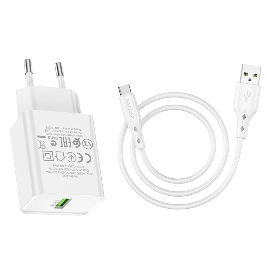 Borofone BN5 Sunlight USB hálózati töltő szett (USB-A, QC 3.0, 18W) fehér, 1m USB Type-C kábellel