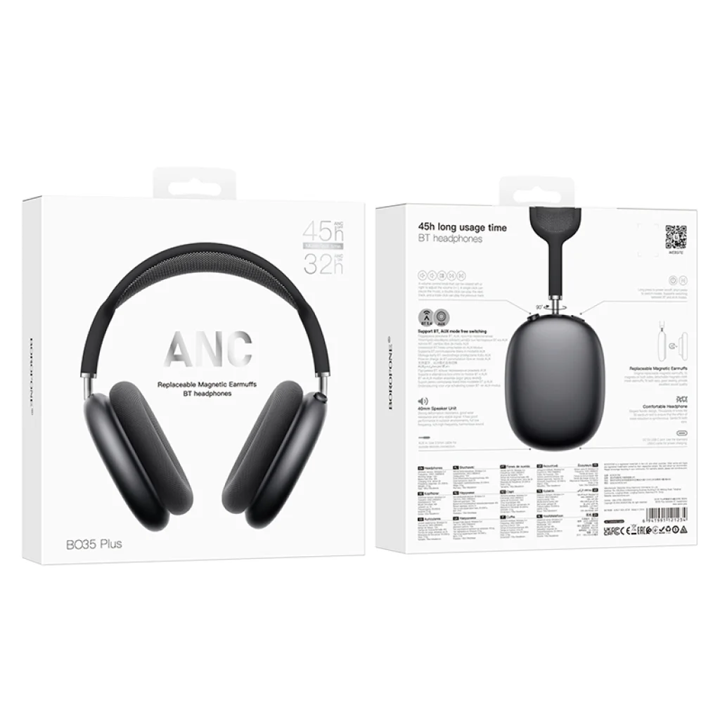 A Borofone BO35 Plus Adorable Fülre helyezhető Bluetooth fejhallgató sötétszürkében fejlett ANC zajszűrő technológiát ötvöz a hosszan tartó kényelemmel. A Bluetooth 5.4 és a JL7006F8 chip segítségével gyors párosítást és stabil kapcsolatot biztosítanak. 400 mAh-s akkumulátora akár 45 órányi lejátszást biztosít egyetlen feltöltéssel, a teljes feltöltési idő körülbelül 2 óra. Az ANC támogatás mellett kínai és angol nyelvű hangüzeneteket is nyújtanak – a bekapcsoló gomb kétszeri megnyomásával, amikor nincs párosítva. Cserélhető szövet fülpárnák növelik a kényelmet és a higiéniát. -Bluetooth: 5.4, Chip: JL7006F8 -Akkumulátor kapacitás: 400 mAh; Töltési idő: kb. 2 óra -Lejátszási idő: akár 45 óra -Anyag: ABS -Méret: 195 × 186 × 84 mm -Súly: 210 g -Jellemzők: ANC (Aktív zajszűrés) -Hangjelzések: kínai és angol (bekapcsoló gomb kétszeri megnyomása, amikor nincs párosítva) -Fülpárnák: cserélhető szövet párnák