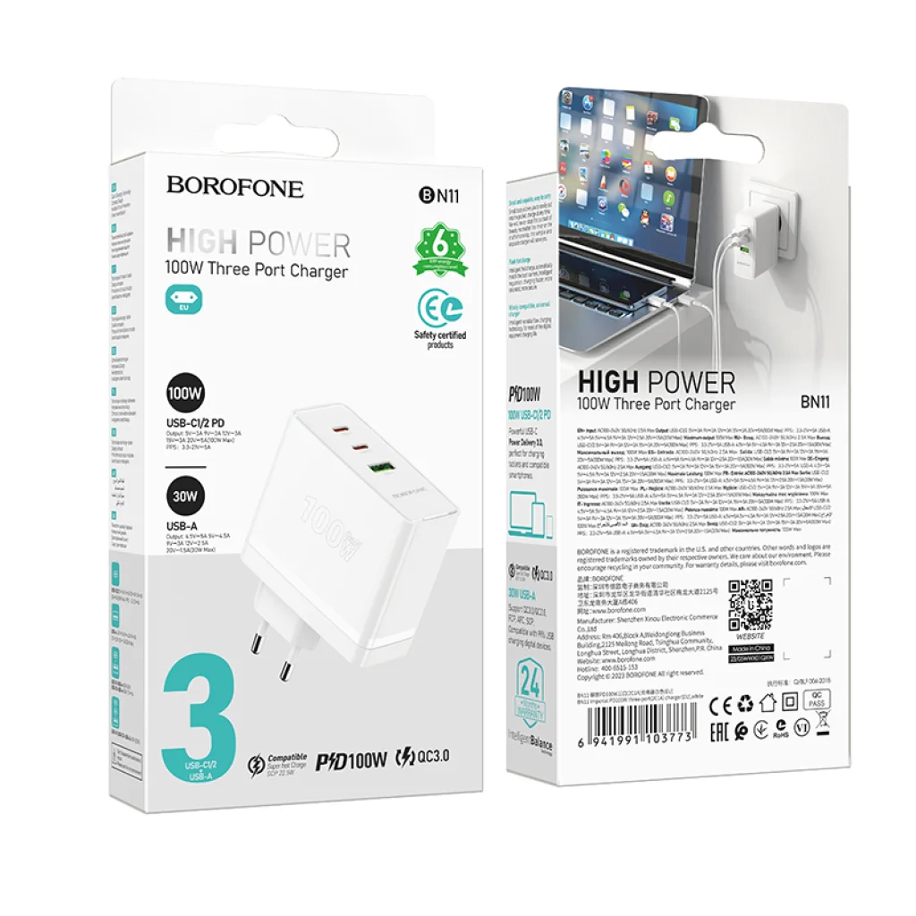A Borofone BN11 Imperial hálózati töltővel búcsút inthet a több töltőnek és a lassú töltésnek! Ez a kiemelkedő teljesítményű, GaN technológiás adapter forradalmasítja eszközeinek energiaellátását, legyen szó laptopról, tabletről vagy okostelefonról. Élvezze az akár 100W-os, villámgyors és intelligens töltést három eszköz egyidejű töltése mellett.