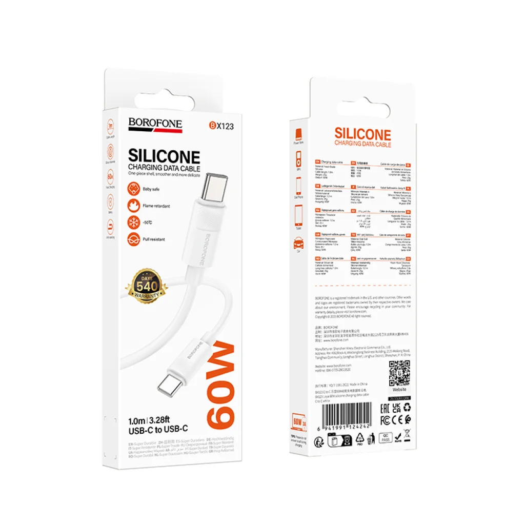 A kábel különleges, bababarát szilikon borítást kapott, amely nemcsak rendkívül rugalmas és kellemes tapintású, hanem ellenáll a mindennapi használat során fellépő kopásnak, húzásnak és a szélsőséges hőmérsékletnek is (-60°C és 200°C között). Lángálló tulajdonsága tovább növeli a biztonságot, így ez a Borofone kábel hosszú távon megbízható társad lesz, megóvva eszközeidet és otthonodat.