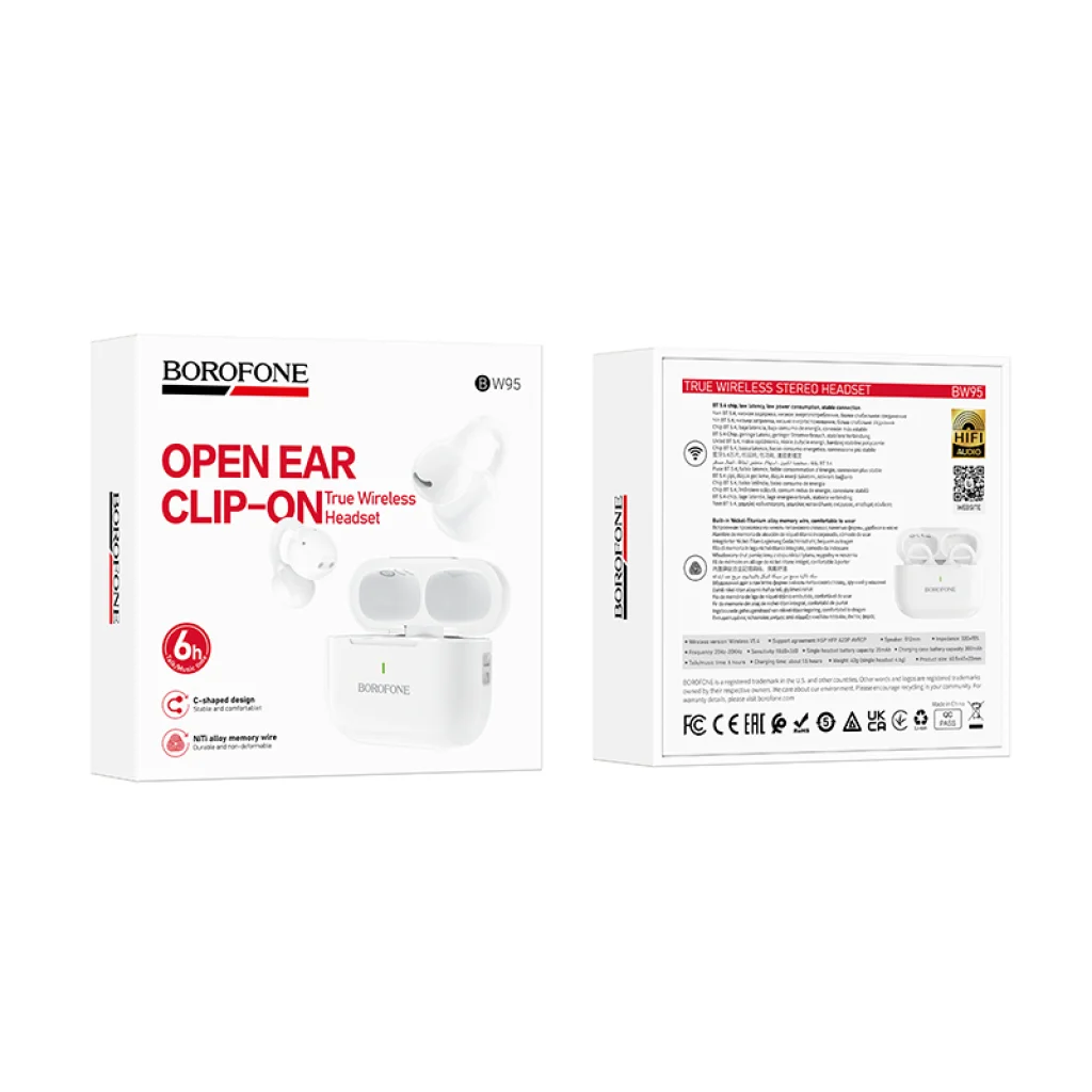 • Nyitott fülű, klipszes kialakítás: A Borofone BW95 Cancion egyedi, C-alakú, klipszes kialakítással rendelkezik, amely biztonságos és stabil illeszkedést biztosít anélkül, hogy bemenne a fülcsatornába. Ez a „nem fülbe illeszkedő” (open ear, clip-on) kialakítás hosszú órákon át tartó viselés esetén is maximális kényelmet garantál, fülnyomás nélkül, miközben a környezeti hangokat is érzékelni tudja. A NITI ötvözetből készült memóriahuzal további rugalmasságot és tartósságot biztosít.