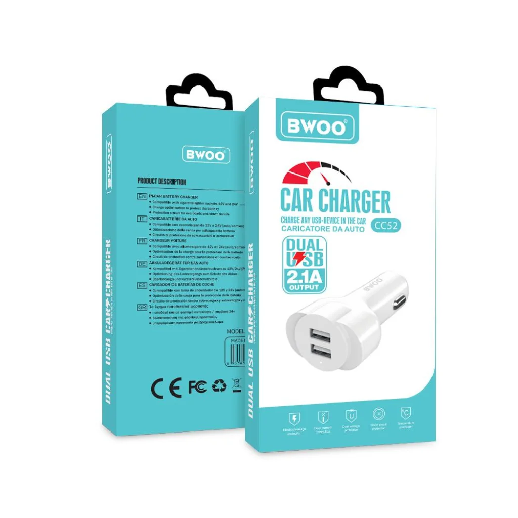 A BWOO CC52 egy dupla USB aljzattal rendelkező autós töltő, amelyre a megfelelő kábelt csatlakoztathatja mobil eszközök töltéséhez. A töltő kis méreteinek köszönhetően a készülék kis helyet foglal.