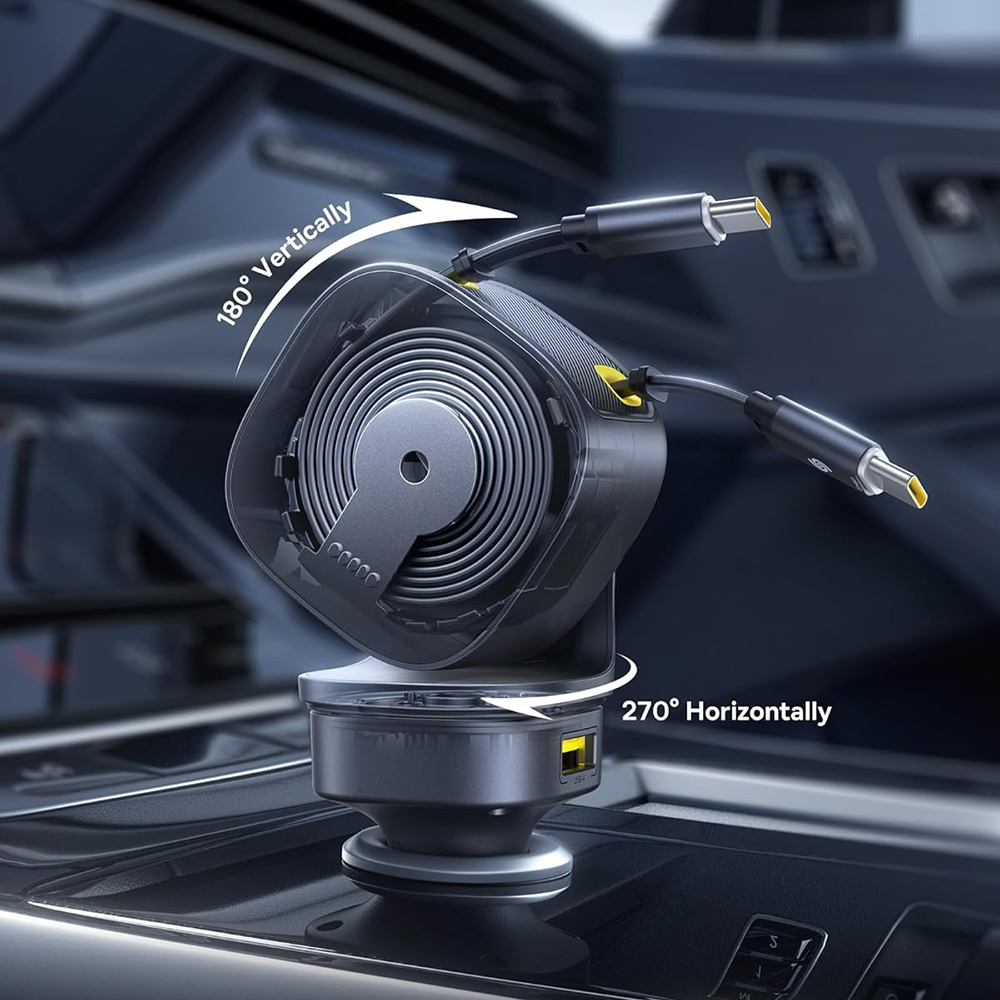 • 2 db visszahúzható USB-C kábel: Nincs többé kuszálódó kábel az autóban! A két beépített, 80 cm hosszú USB-C kábel elegánsan elrejthető, amikor nincs rájuk szükség, így autója rendezett marad.