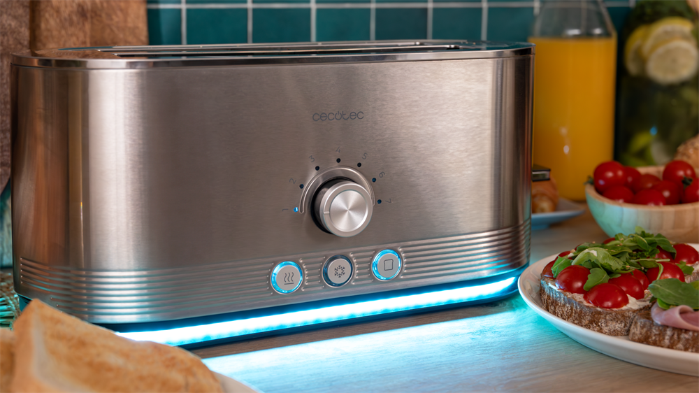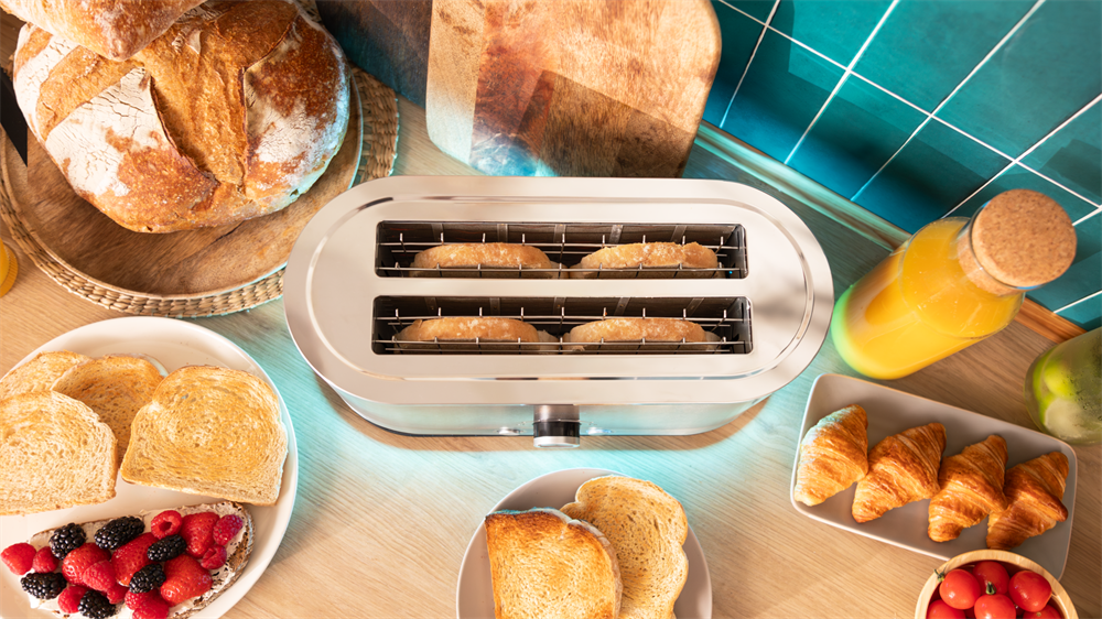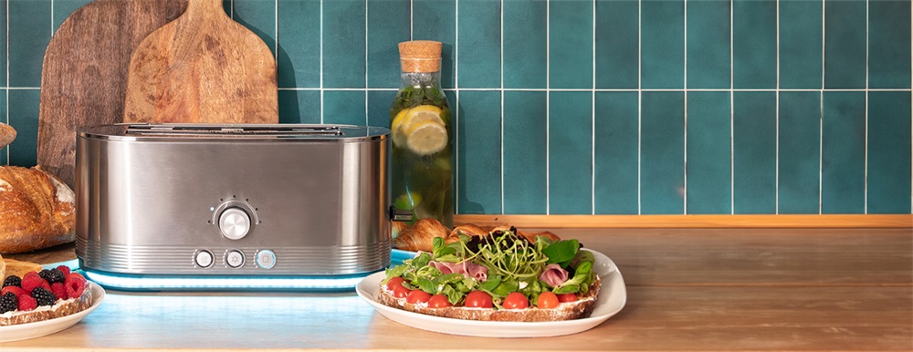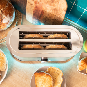 Két extra hosszú nyílásának köszönhetően egyszerre akár négy szelet kenyér pirítására is alkalmas, vagy kényelmesen elhelyezheti benne a nagyobb, hosszúkás kenyérszeleteket. A készülék elegáns, szálcsiszolt rozsdamentes acél burkolata és az alján végigfutó, hangulatos kék LED világítás modern megjelenést kölcsönöz a konyhájának, stílusos fényt árasztva a pultján.