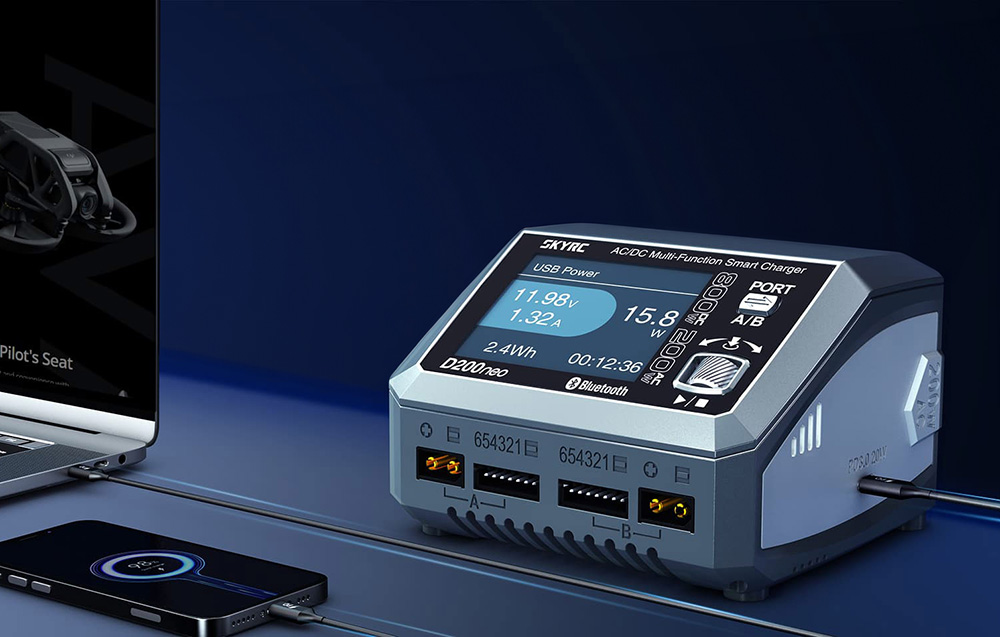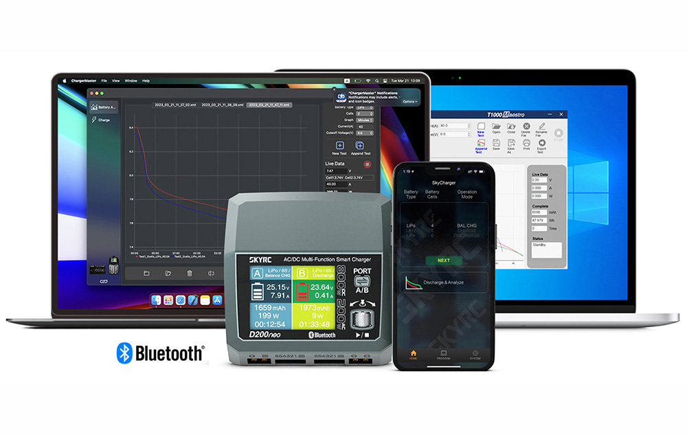 A D200neo USB-C-n keresztül PC-hez vagy Mac számítógéphez csatlakoztatva lehetővé teszi a SkyRC Charger Master alkalmazáson keresztül történő felügyeletet és vezérlést. A töltőt OTA-frissítésként is frissítheti, és a legújabb szoftvert valós időben szinkronizálhatja egy dedikált felhőbe. A töltési és kisütési adatok elemezhetők és grafikonon megjeleníthetők. A kezelőfelület jelenleg angol, holland, kínai, francia és japán nyelven érhető el. A felhasználók egyszerű kattintásokkal könnyen megváltoztathatják, így a SkyRC használata még kényelmesebbé válik.