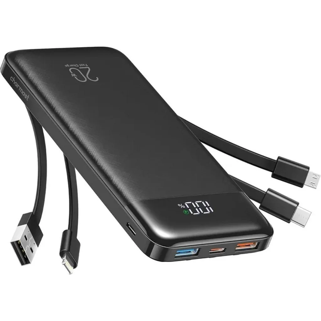 A CHARMAST W1148 10000mAh Powerbank 4 beépített kábellel egy kompakt hordozható töltő, amely 6 kimenetet, 3 bemeneti módot és egy digitális LED kijelzőt kínál a pontos akkumulátorszint figyelésére. A powerbank 3 beépített kimeneti kábellel rendelkezik: Micro USB, USB-C és Lightning, ezáltal lehetővé teszi a legtöbb okostelefon és tablet töltését extra kábelek hordozása nélkül. Tartalmaz standard USB portokat is, így több eszköz egyidejű töltése is megoldható. A készülék 6 kimenetet és 3 módot kínál a powerbank feltöltésére – a beépített USB-A kábelen, Micro USB bemeneten vagy USB-C bemeneten keresztül. Ez a praktikus megoldás növeli a kényelmet és csökkenti a kábelrengeteget. A digitális LED kijelző mutatja a pontos akkumulátor százalékos arányát (0–100%), amely lehetővé teszi a fennmaradó energia pontos nyomon követését. Az intelligens E 3.0 töltési technológia automatikusan észleli a csatlakoztatott eszközöket és a maximális hatékonyság érdekében állítja be a kimenetet. A 10000mAh kapacitás lehetővé teszi több eszköz, például iPhone 11, iPhone 11 Pro, iPhone 11 Pro Max vagy Huawei P20 többszöri feltöltését, így megfelel a mindennapi használatra és utazásra.