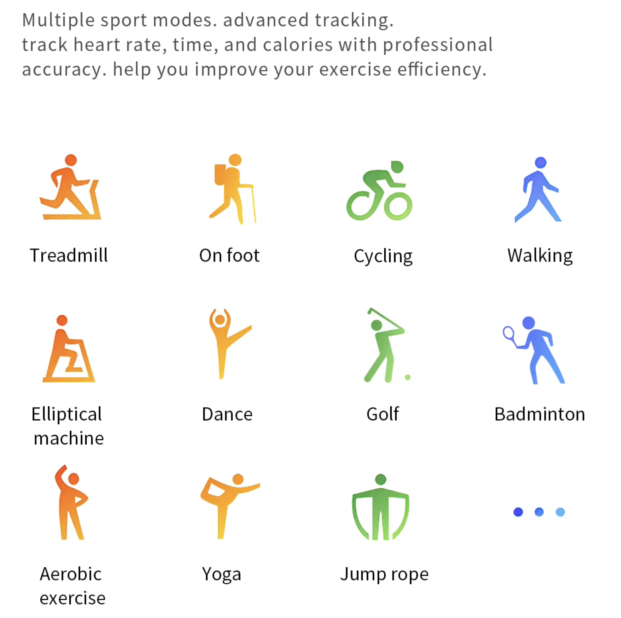- Széles választék: Több mint 100 sportmód közül válogathat, többek között futópad, gyaloglás, kerékpározás, tánc, golf, tollaslabda, jóga, ugrálókötél és sok más.