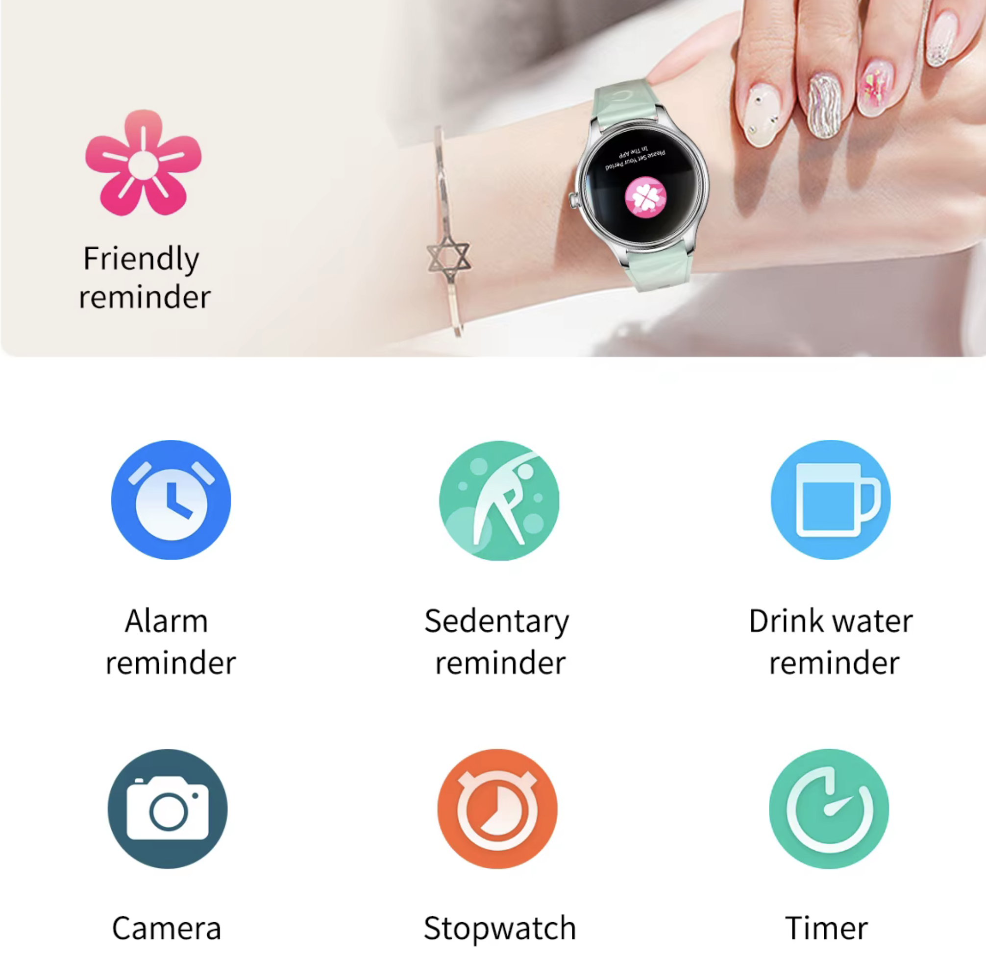 - Női egészségkövetés: Egy gondoskodó társ a nők számára. Az óra intelligensen előrejelzi a menstruációs ciklust, a termékeny időszakot és az ovulációt, részletes nyomon követéssel és elemzésekkel segítve testének ritmusának jobb megértését.