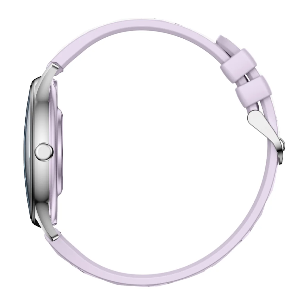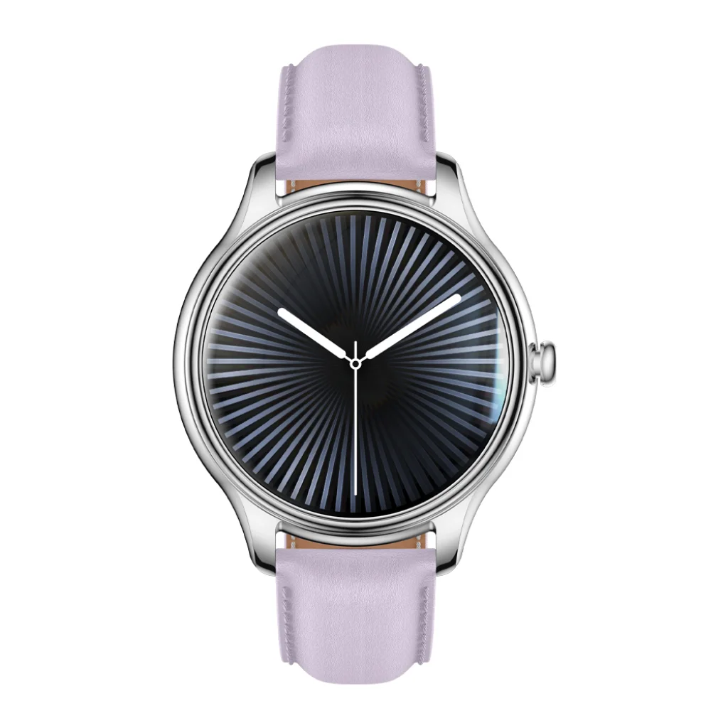 - Prémium anyagok és megjelenés: Az ötvözetből készült tok, a lila szilikon és a bőr szíj kombinációja elegáns és kényelmes viseletet biztosít. A 7.9 mm-es ultra-vékony test és a 3D gömb alakú képernyő igazi vizuális élményt nyújt.