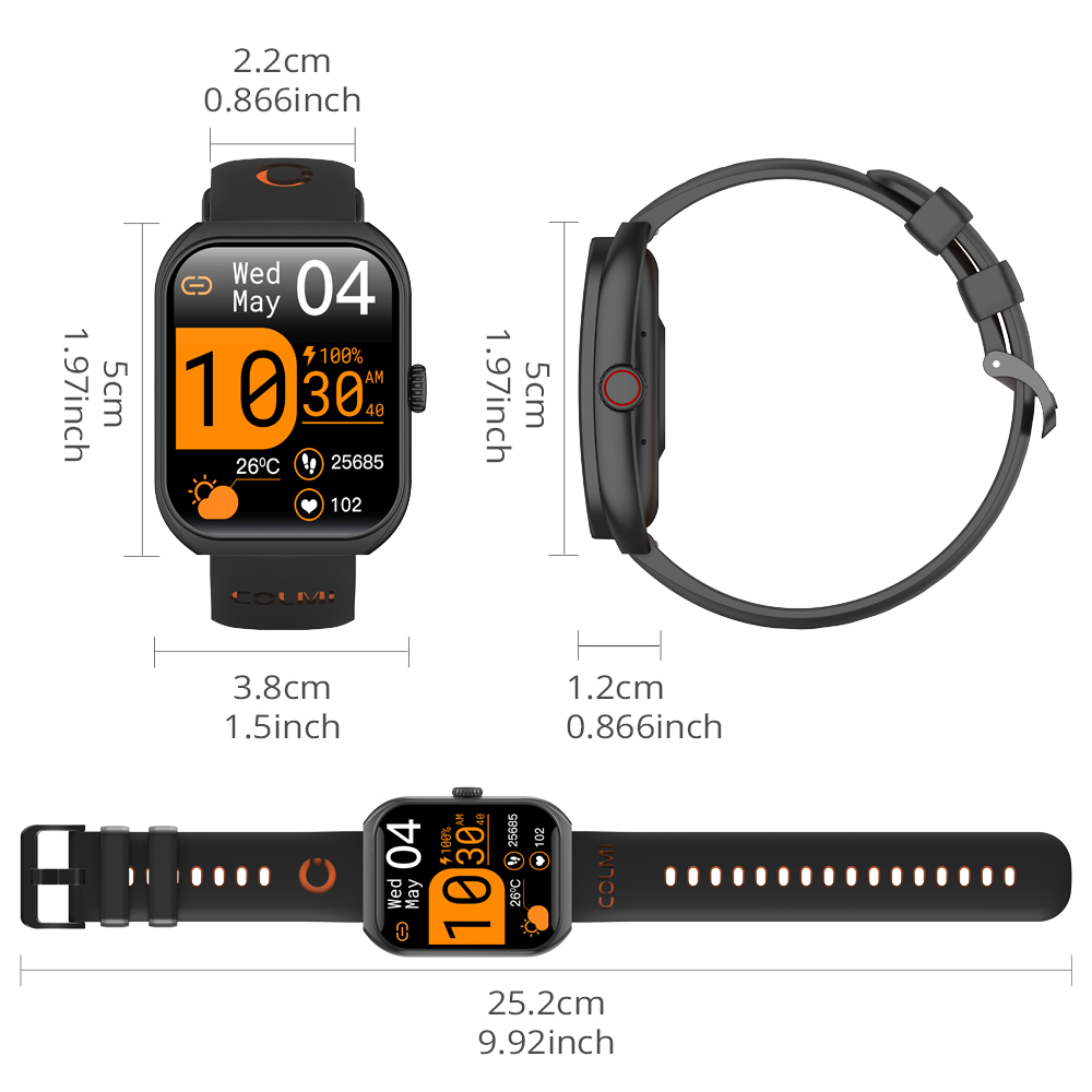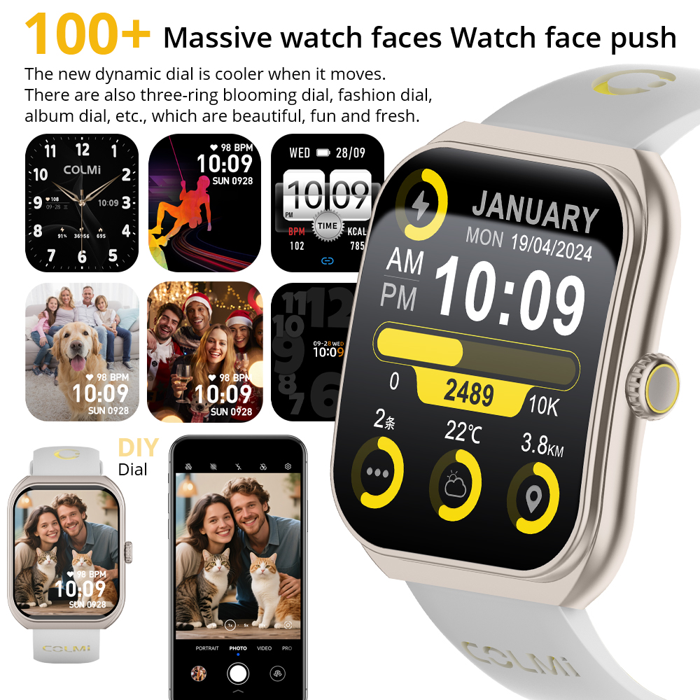 A Colmi P86 egy 1,93 hüvelykes, 368 x 448 pixeles felbontású AMOLED kijelzővel büszkélkedhet, amely lenyűgöző vizuális élményt nyújt éles képekkel és élénk színekkel (98% RGB színskála, 178° betekintési szög). Az Always On Display funkció révén az idő és a legfontosabb információk mindig szem előtt vannak, anélkül, hogy fel kellene ébreszteni az órát. Több mint 100 előre telepített óralap közül választhat, köztük dinamikus és interaktív megjelenésekkel, sőt, saját kedvenc fotóival is személyre szabhatja az óralapot, így tükrözve egyedi stílusát. Az innovatív forgatható korona (oldalsó gomb) egyszerűvé és zökkenőmentessé teszi a menükben való navigálást, a nézetek váltását és a tartalom nagyítását/kicsinyítését.