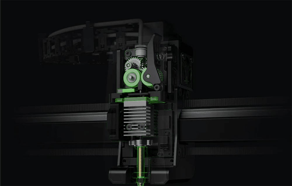 Az új direkt extruder a filament pozícionáló érzékelőkkel biztosítja a pontos anyagáramlást és az adagolás vezérlését. Olyan edzett acél fogaskerekeket használ, amelyek képesek szénszál-erősítésű filamentekkel dolgozni. A 40 mm³/s áramlási sebességű hotend az anyagok széles skálájából való nyomtatást teszi lehetővé, a moduláris kialakítás és a mágneses fedél pedig megkönnyíti a fej gyors eltávolítását és karbantartását.