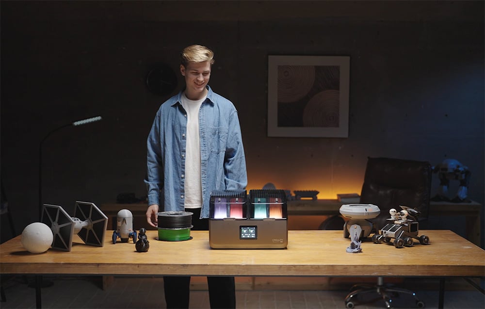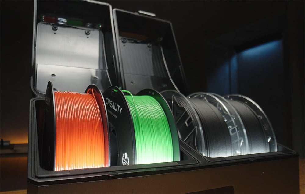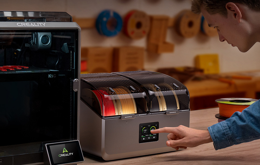 A készülék két egymástól függetlenül szabályozható fűtőkamrával rendelkezik, így különböző hőmérsékleteket állíthat be a különböző filamentekhez (pl. 50°C PLA-hoz és 85°C PA-CF-hez). Szükség szerint használhatja az egyik vagy mindkét kamrát, ami időt és energiát takarít meg egy kis műhelyben, vagy ha egyszerre különböző anyagokkal dolgozik.