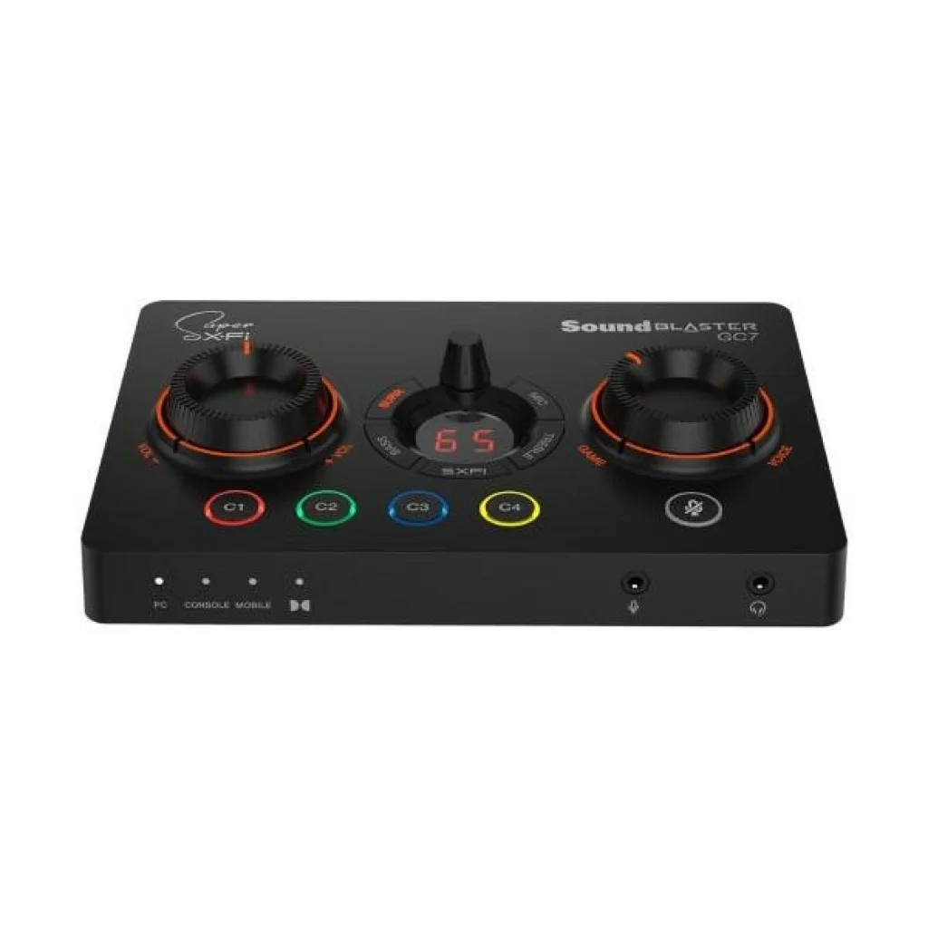 A Sound Blaster GC7 digitális-analóg konverterként és USB játékközvetítő erősítőként szolgál, programozható gombokkal és Super X-Fi technológiával. Négy programozható gomb található a házon, amelyek gyors hozzáférést biztosítanak a mentett beállításokhoz. Minden gombot testreszabhat igényei szerint. Indíthatnak külső alkalmazásokat, vagy aktiválhatnak bizonyos streaming beállításokat makrókon keresztül. Az RGB világítást is testreszabhatja minden gomb számára, hogy illeszkedjen a többi felszereléséhez és játékaihoz. A Sound Blaster GC7 GameVoice Mix funkciója lehetővé teszi a játékhangok és a beszélgetések egyensúlyának szabályozását, anélkül hogy elhagyná a játék képernyőt vagy megnyitná a keverő beállításait. Olyan intuitív, hogy módosításokat is végezhet anélkül, hogy ránézne az eszközre. A Sound Blaster GC7 szívében az audiófil minőségű AKM4377 digitális-analóg konverter található, amely alacsony zajszintet (< -120 dB), alacsonyabb torzítást és tisztább hanghatásokat nyújt. Az eszköz lehetővé teszi a 24-bites / 192 kHz-es PCM audio streaminget és a kiváló minőségű hang hallgatását, függetlenül a felhasznált forrástól. A Sound Blaster GC7 mind a Sound Blaster hangfeldolgozó funkciókkal, mind a díjnyertes Super X-Fi fejhallgató holográfia technológiával fel van szerelve, és egy kettős DSP chip rendszer hajtja, hogy előnyt biztosítson az ellenfelek fölött az olyan hihetetlen játékszolgáltatásokkal, mint a Scout Mode és az SXFI BATTLE Mode.
