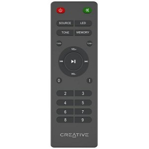 Vezeték nélküli távirányító előre beállított EQ-beállításokkal, valamint basszus és magas hangszínek állításával.