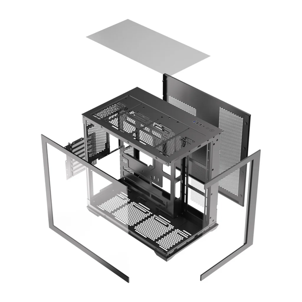 A DarkFlash C280 egy tágas számítógép-ház, amelyet komplex konfigurációkhoz és lenyűgöző alkatrész-megjelenítéshez terveztek. Támogatja az E-ATX, ATX, Micro-ATX és ITX alaplapokat, valamint a legfeljebb 420 mm hosszú grafikus kártyákat és a legfeljebb 155 mm magas CPU-hűtőket. Ez nagy szabadságot biztosít az alkatrészek kiválasztásában. A 443 × 277 × 426 mm-es kialakítás SPCC fémlemezből készült, és edzett üvegpanelekkel egészül ki a tartósság és a modern megjelenés érdekében. A készlet 7 ventilátort is tartalmaz, így már a kezdetektől gondoskodhat a megfelelő hűtőrendszerről.