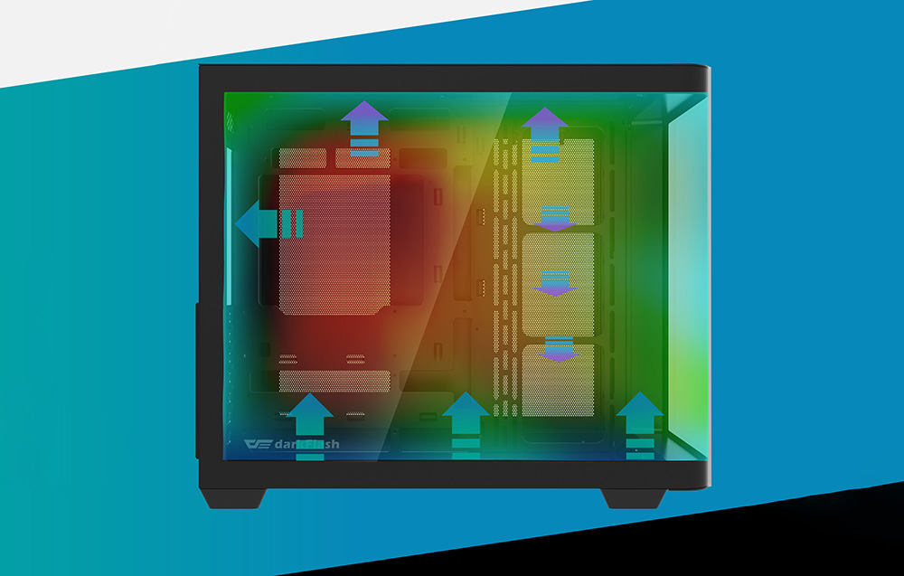 A fejlett szellőzőrendszer akár 10 darab 120 mm-es vagy 4 darab 140 mm-es ventilátor beépítését is lehetővé teszi az optimális légáramlás és a kiváló alkatrészhűtés érdekében. A moduláris hőkezelő rendszer hatékonyan vezeti el a felgyülemlett hőt, így a hőmérséklet intenzív működés közben is alacsony marad.