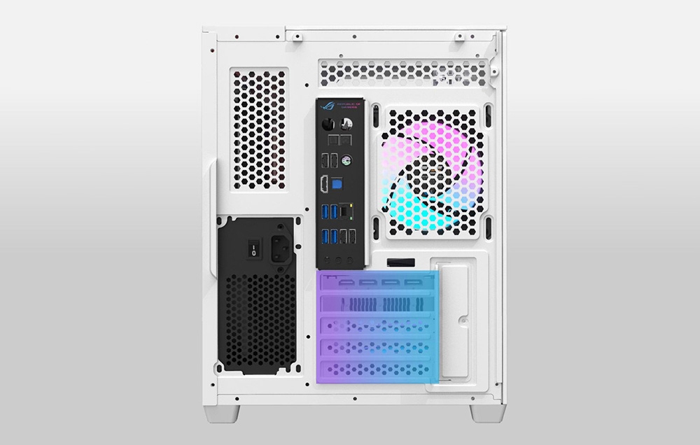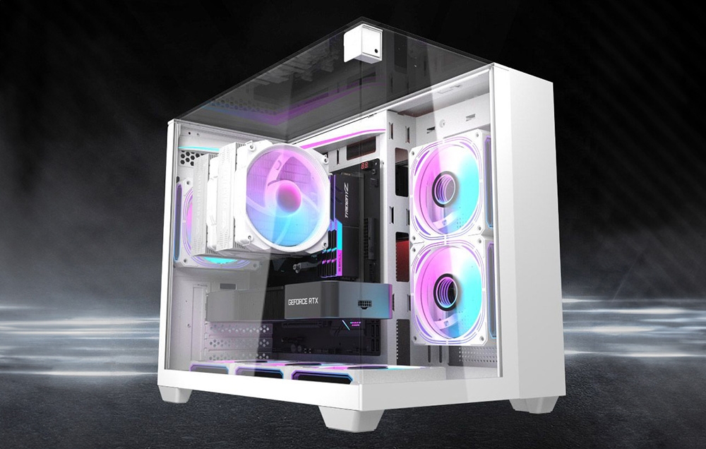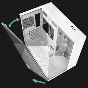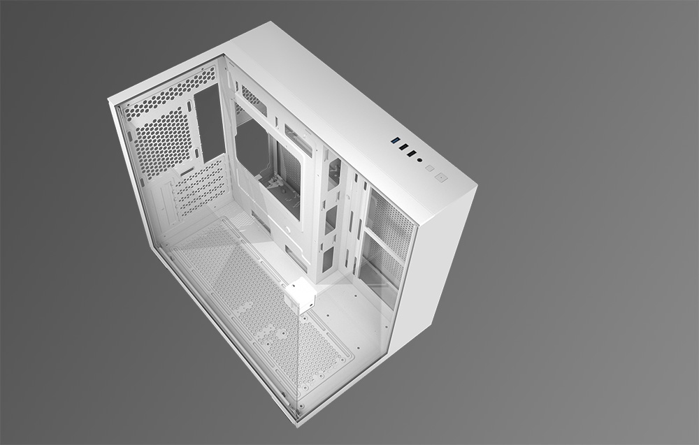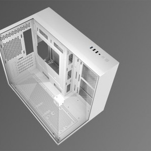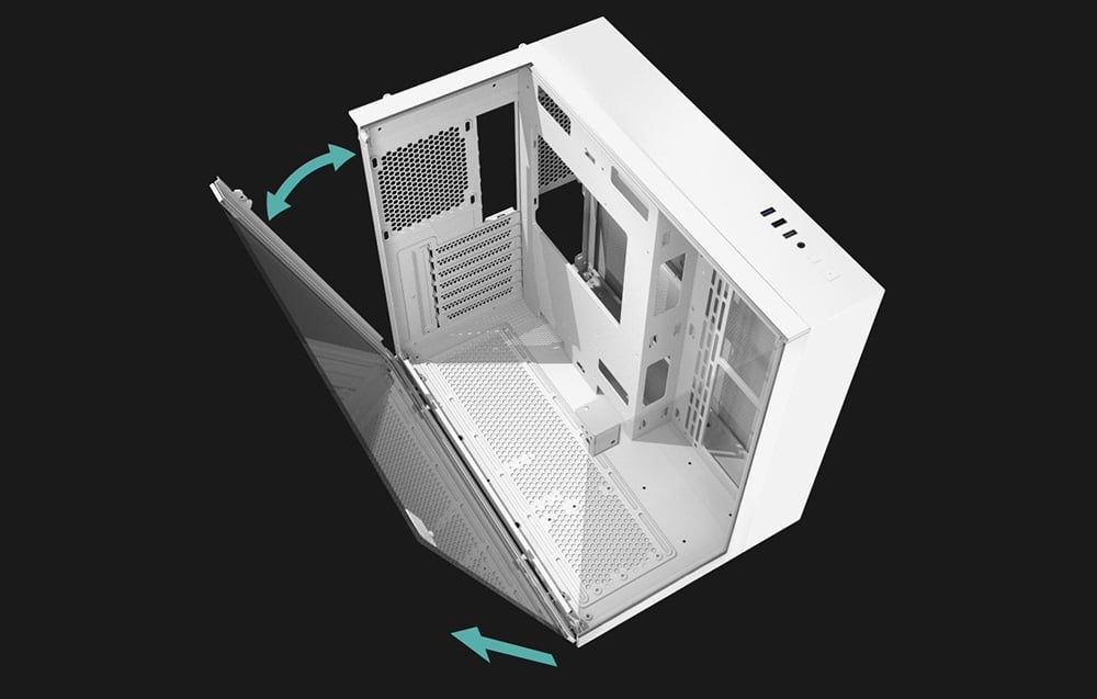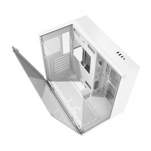 Átlátszó kialakítás három oldalon: A tokot nem kevesebb, mint három átlátszó, edzett üvegből készült panel különbözteti meg, amelyek lehetővé teszik, hogy könnyedén megtekinthesse a beállítás minden részletét. Az átlátszó kialakítás nemcsak az alkatrészek esztétikáját emeli ki, hanem lehetővé teszi, hogy könnyedén ellenőrizze az alkatrészek állapotát és a hűtés hatékonyságát. A hüvelykujjas csavarral szerelt oldalsó panel megkönnyíti a gyors hozzáférést a tok belsejéhez. Munkaterülete mostantól futurisztikus dizájnjával lenyűgöző lesz.