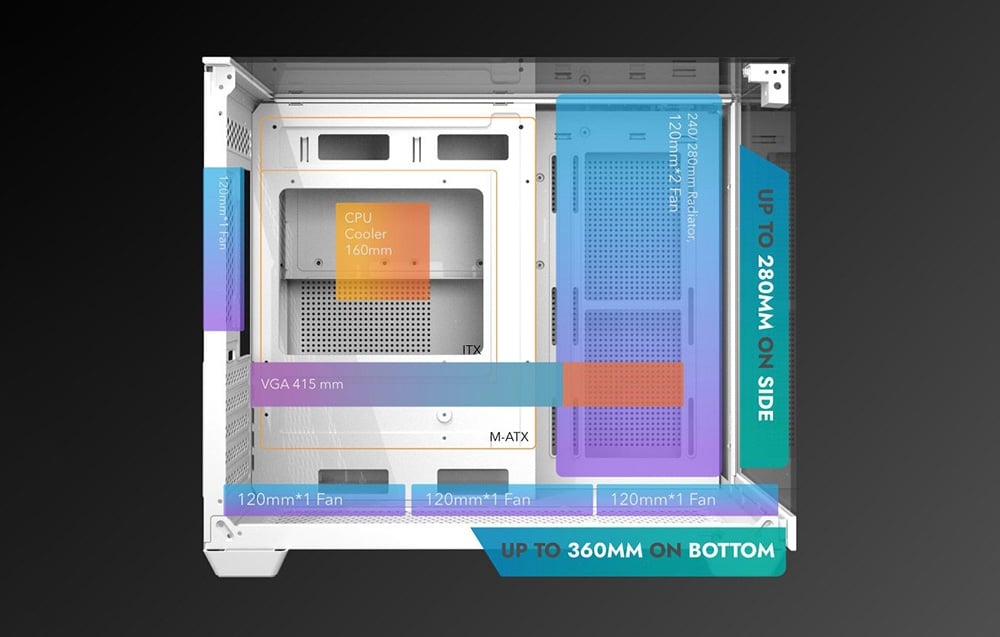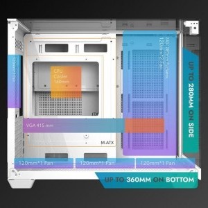 Fejlett hűtési képességek: A TH285M-et az optimális légáramlást szem előtt tartva tervezték. Akár hat 120 mm-es vagy két 140 mm-es ventilátort, valamint 360 mm-es vízhűtést is támogat. Ez a konfiguráció még intenzív rendszerterhelés mellett is alacsonyan tartja a hőmérsékletet, így ez a ház ideális a játékosok és fejlesztők számára, akiknek szükségük van a komponensek stabil működésére.
