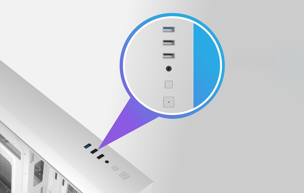 Kényelmes hozzáférés a portokhoz: Az előlapon a portok áttekinthető és szervezett elrendezését találja, köztük egy USB 3.0 és két USB 2.0 csatlakozót, amelyekkel gyorsan hozzáférhet az adatátvitelhez és a perifériák töltéséhez. Ezáltal a tartozékok és a külső memória csatlakoztatása gyors és kényelmes.