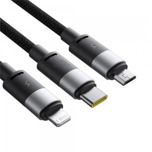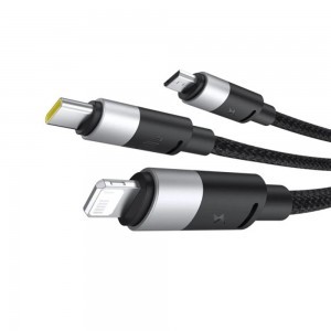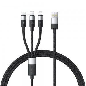A Baseus Cluster Black kábel gondoskodik róla, hogy soha ne maradjon töltés nélkül, bármilyen eszköze is legyen kéznél. Az egyik végén egy szabványos USB-A csatlakozó található, amely szinte bármilyen töltőadapterhez vagy USB porthoz illeszkedik, míg a másik oldalon három praktikus kimeneti csatlakozó várja a készülékeit: egy modern Type-C, egy villámgyors Lightning és egy klasszikus Micro-USB. Töltsön egyszerre telefont, tabletet, fejhallgatót és egyéb okoseszközöket, rendet tartva az asztalon vagy az utazótáskában.