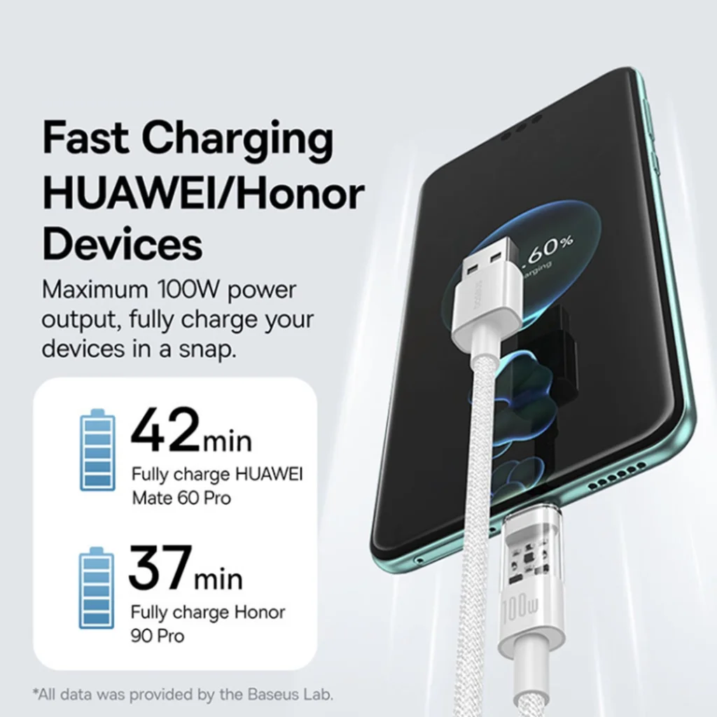 - HUAWEI/Honor gyorstöltés: Optimalizált a HUAWEI és Honor készülékek számára. Például egy HUAWEI Mate 60 Pro 42 perc alatt, egy Honor 90 Pro pedig mindössze 37 perc alatt teljesen feltölthető.*