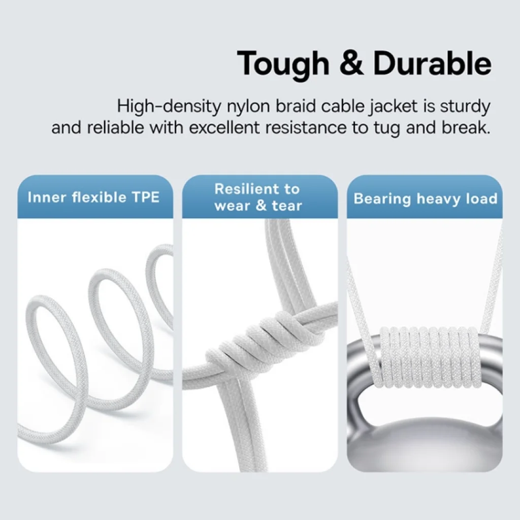 - Magas sűrűségű fonott kábelköpeny: A kábel kiváló minőségű, nagy sűrűségű nejlon fonattal készült, amely ellenáll a húzásnak, a kopásnak és a szakadásnak, garantálva a hosszú élettartamot.