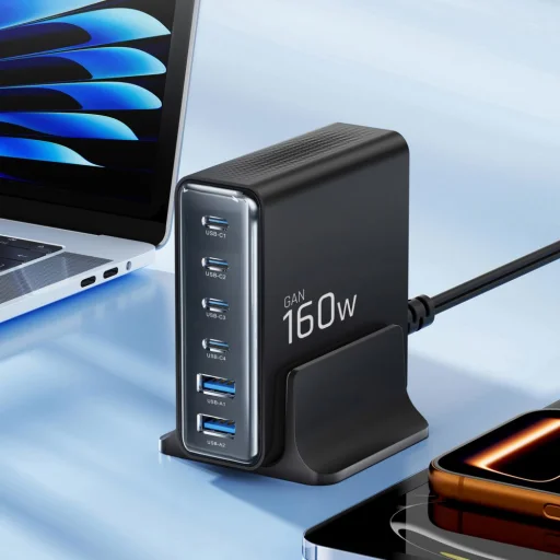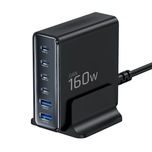 A DC160W-GAN adapter négy Type-C és két USB-A porttal rendelkezik, maximális rugalmasságot biztosítva a mindennapi használat során. A portok elosztása és teljesítménye ideálisan alkalmazkodik a modern eszközök igényeihez: