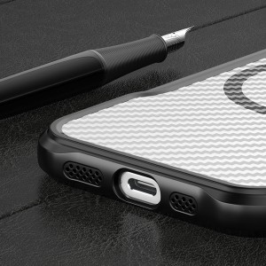 A pontos kivágások a kamera védelmére és teljes funkcionalitását biztosítják a lencséknek akadályoztatás nélkül. A szénszálas textúra javítja a fogási ergonomikát, biztosítja a modern dizájnt és csökkenti a foltokat. A MagSafe kompatibilitás működik töltőkkel, autós tartókkal és más mágneses kiegészítőkkel. A megemelt szélek hatékonyan elnyelik a sokkokat és ütéseket, további védelmet nyújtva a károsodások ellen a mindennapi használat során.