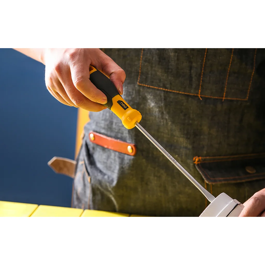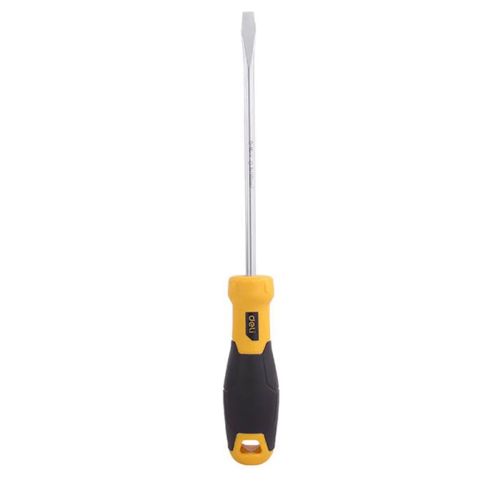 Kényelmesen használható, strapabíró, 6x150 mm -es laposfejű csavarhúzó sárga színben. A termék fogantyúja kiváló minőségű műanyagból készült. Praktikus lyukkal rendelkezik, amely lehetővé teszi a szerszám felakasztását, például egy szerszámtáblára. A csavarhúzó mágneses csúccsal is fel van szerelve, ami nagyban megkönnyíti a munkáját.