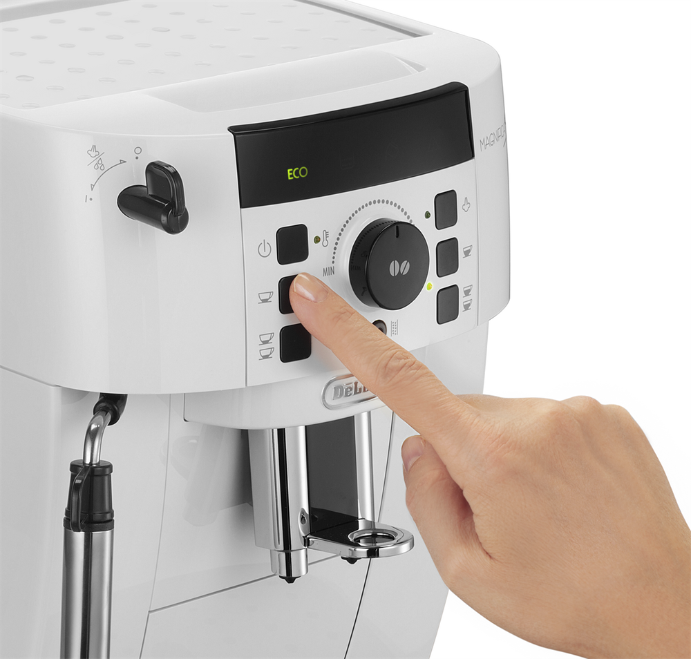 A Magnifica S intuitív kezelőpanelje egyszerű és gyors kávékészítést tesz lehetővé. A forgatógomb segítségével könnyedén beállíthatja az adag méretét és az aroma intenzitását, míg az egyérintéses gombokkal pillanatok alatt elkészítheti kedvenc eszpresszóját (akár egyszeres, akár dupla adagban), vagy hosszú kávéját. Élvezze a személyre szabott kávé élményét minden nap!